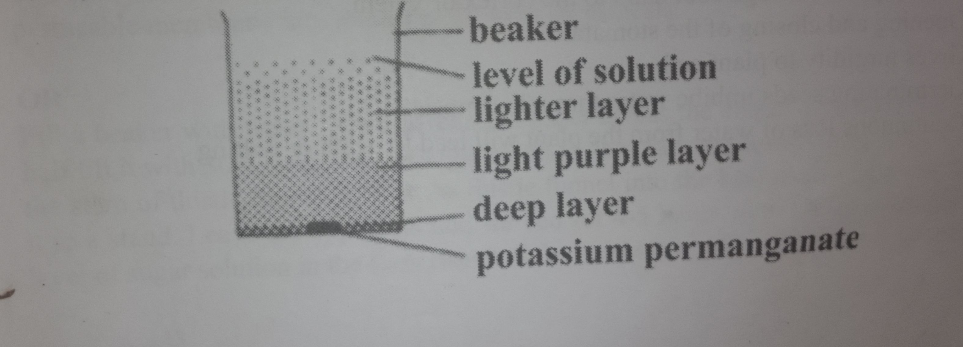 Half fill a beaker with water and put a grain of potassium permanganate into the water in the beaker. Leave the beaker on a flat table for about 40 minutes. After sometime the particles of the potassium permanganate spread to other parts of the water in the beaker and eventually the colour becomes the same all through the liquid. That means that the particles of potassium permanganate have diffused evenly through the water.